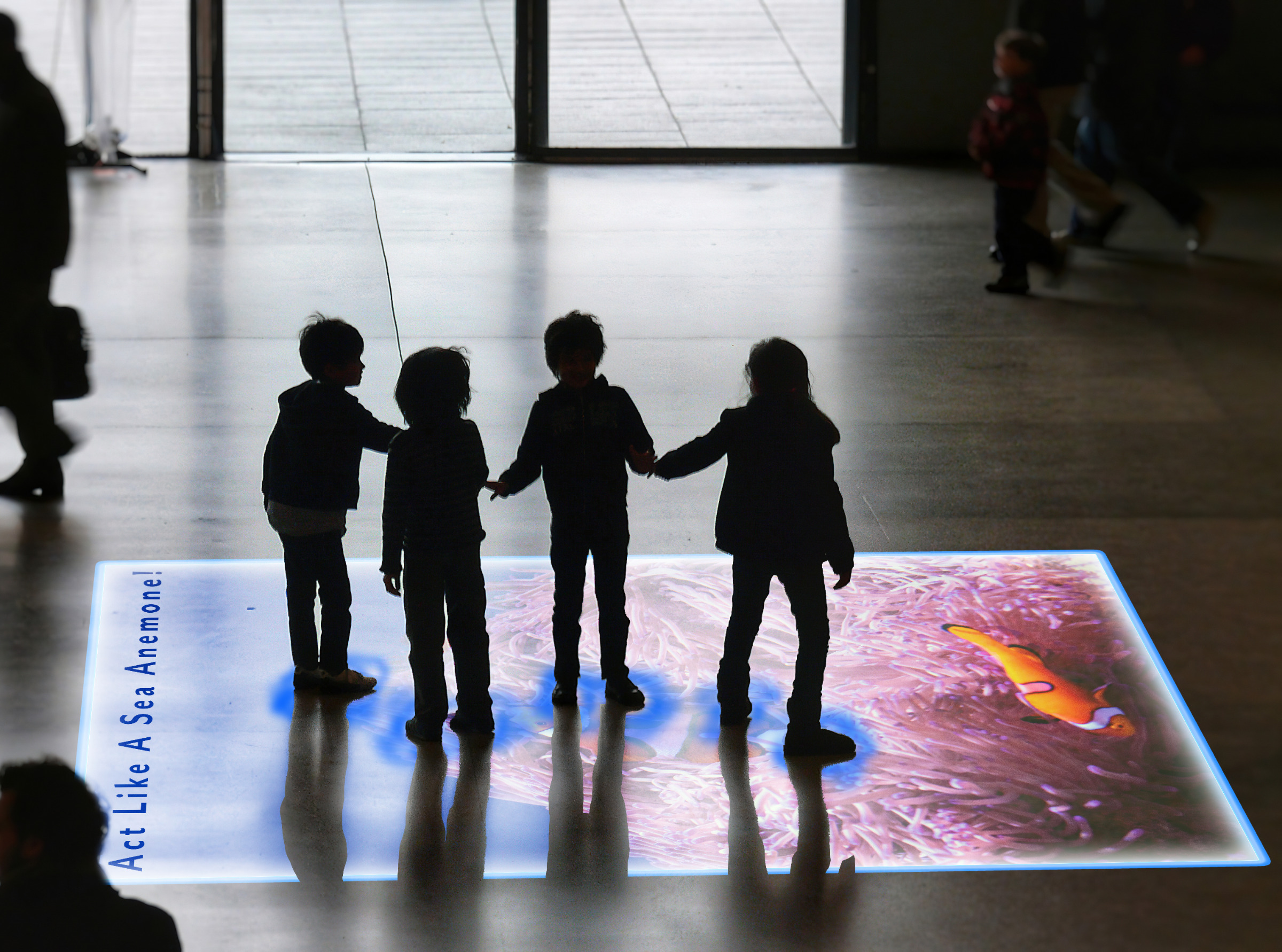 This was my idea that was inspired by the interactive projections I remember inside malls when growing up. I thought this would be good inside of the aquarium because there was a big empty section in the main building. The projectors from the mall were strong enough to project in a high level of light, allowed for interaction without needing any physical touch which is great for our current times with COVID.
